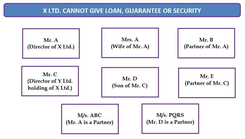 Any Company cannot provide, directly or indirectly, any loan, including any loan represented by a book debt to, or give any guarantee or provide any security in connection with any loan taken by, any of the following persons:
