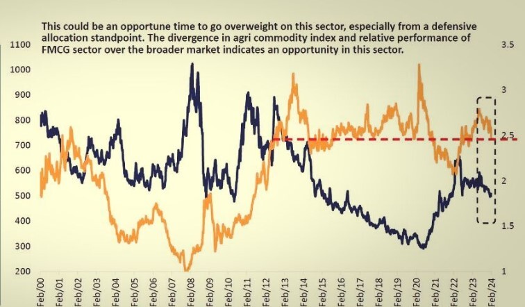 Markets now are dwindling in a range, neither upside nor downside, but one could look at theme such as Capital goods, Electrification, Manufacturing, Auto, FMCG (Contraction view), because whenever the agricultural and commodities price decline it aids the FMCG sector. The S&P Agricultural index is at 2 year low and noting that FMCG has been underperformer when compared to Nifty.