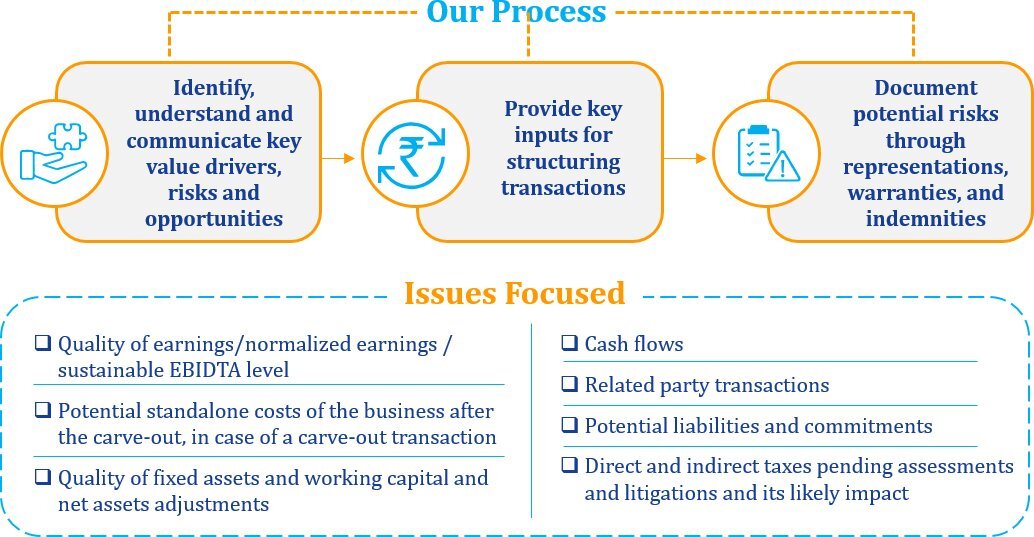 We provide financial, tax and corporate law due diligence support to our clients for inbound and outbound transactions. Our process also establishes the risk profile for an investment and supplements the validation of business assumptions and valuation benchmarks being used.