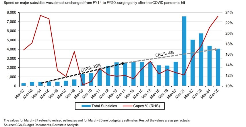 The growth of subsidies as a percentage of government spending surged at a 19% compound annual growth rate (CAGR) from FY04 to FY14. However, from FY14 to FY24, the growth rate of subsidies slowed to 4%. (This is when the MODI government had strong majority)