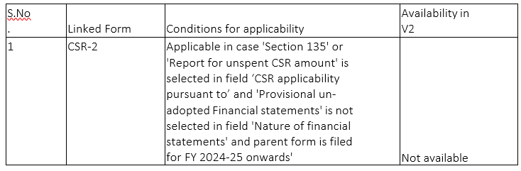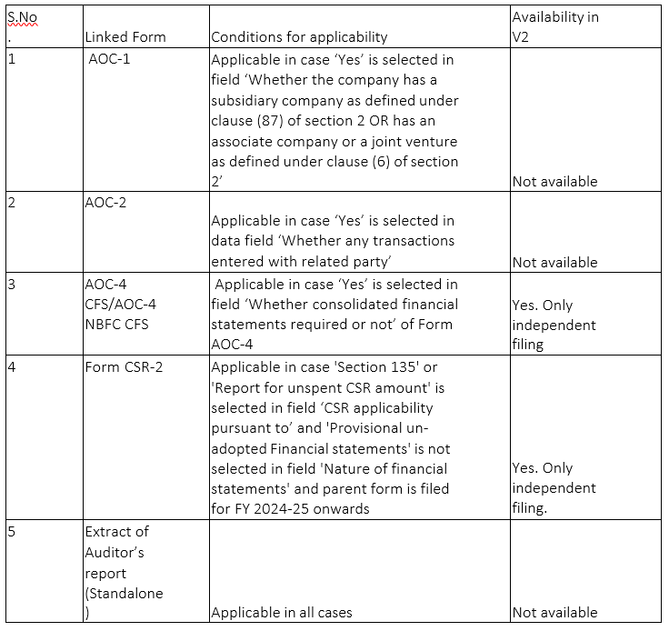 From Financial year 2024-25 onwards in V3, form to be filed as linked filing with AOC-4/AOC-4 NBFC/AOC-4 XBRL based on the applicability mentioned FAQ no. 9.