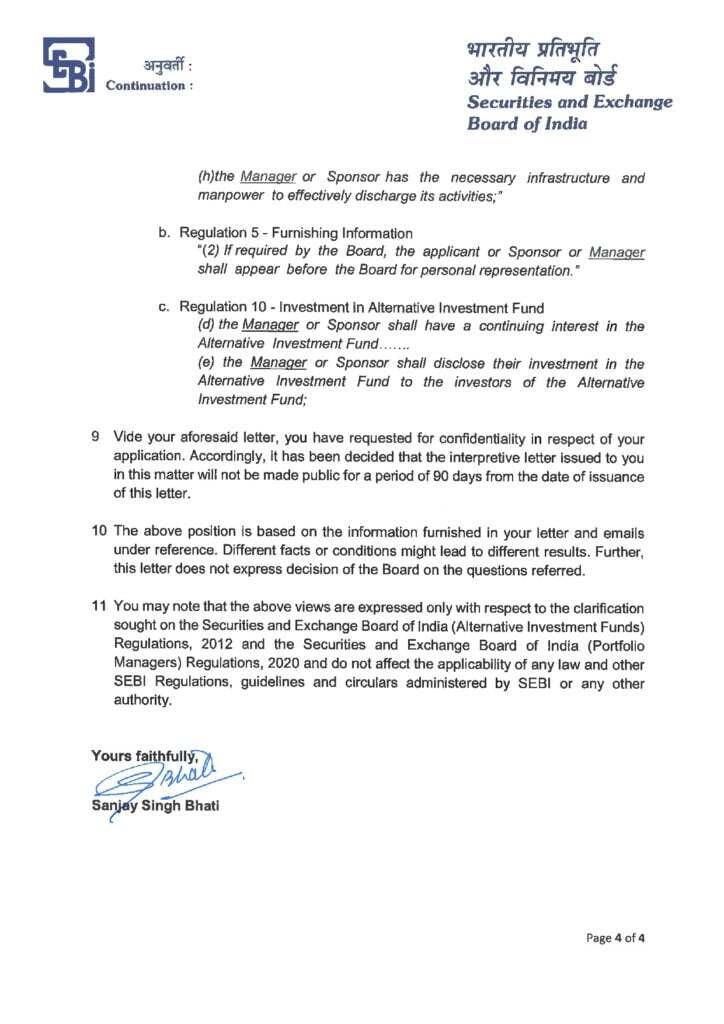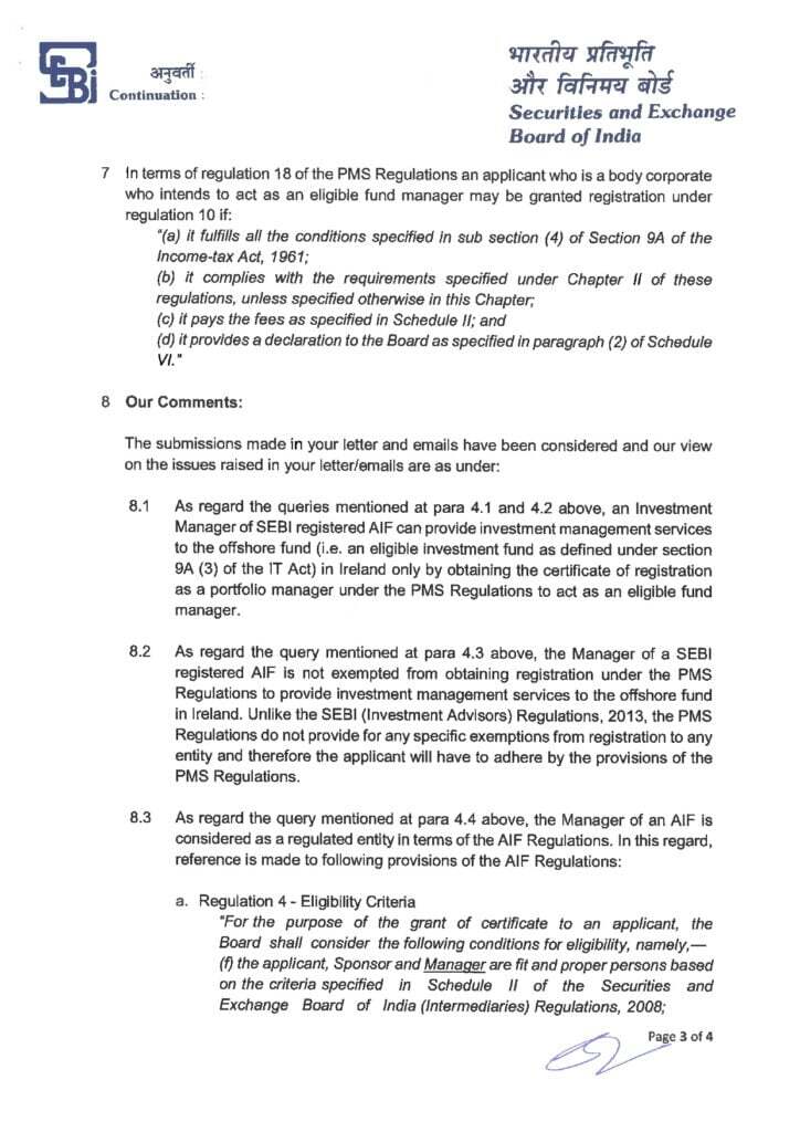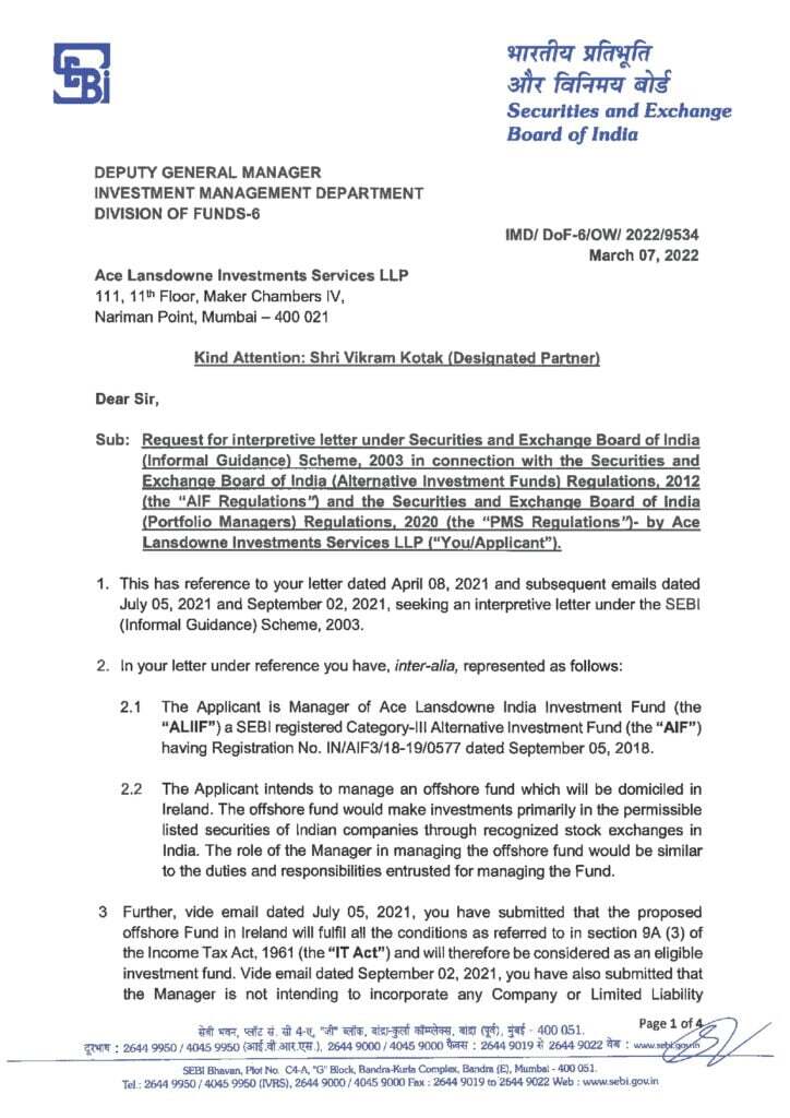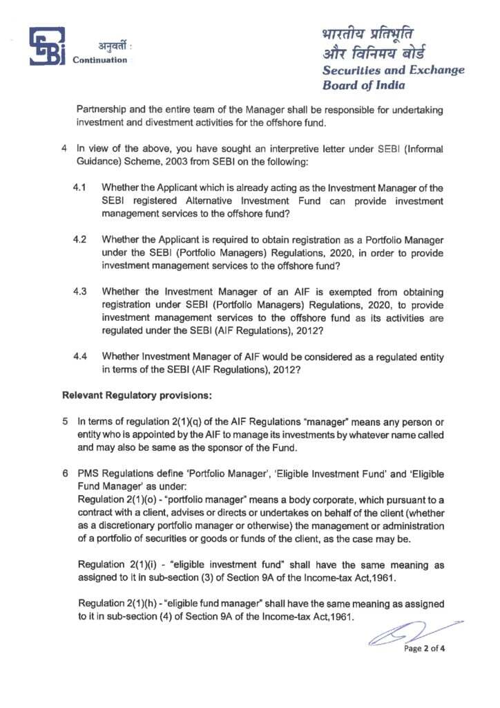 A manager of the SEBI registered AIF ‘Ace Lansdowne India Investment Fund’, sought an interpretative letter under the SEBI (Informal Guidance) Scheme, 2003 on the issue that in case applicant who is already acting as the Investment Manager of the SEBI registered AIF can provide investment management services to the offshore fund. SEBI clarified AIF can provide investment management services to the offshore fund only by obtaining the certificate of registration as a portfolio manager.