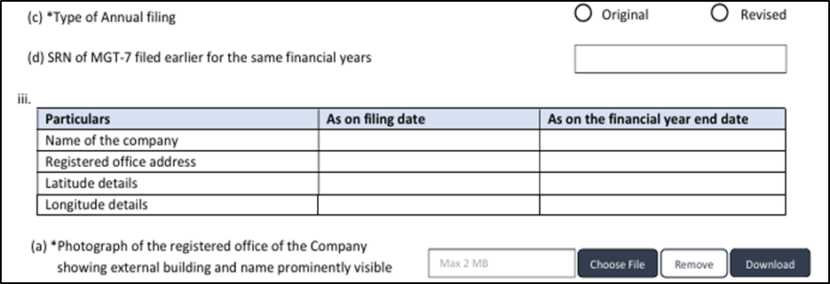 - Table asking for details of name, registered office latitude and longitude as on filing date and year end date.