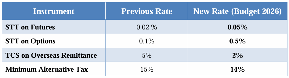 - STT Hike (F&O): To discourage excessive retail speculation, the Securities Transaction Tax (STT) on Futures is now 0.05%, and Options is 0.15%.